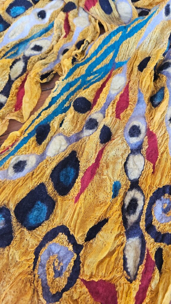 As an Australian contemporary felt artisan and designer, I work with an eclectic mix of wool fibres, fabrics, silks, threads and recycled materials, to produce rich, soulful, unique, artworks and art wearables that tell a story.